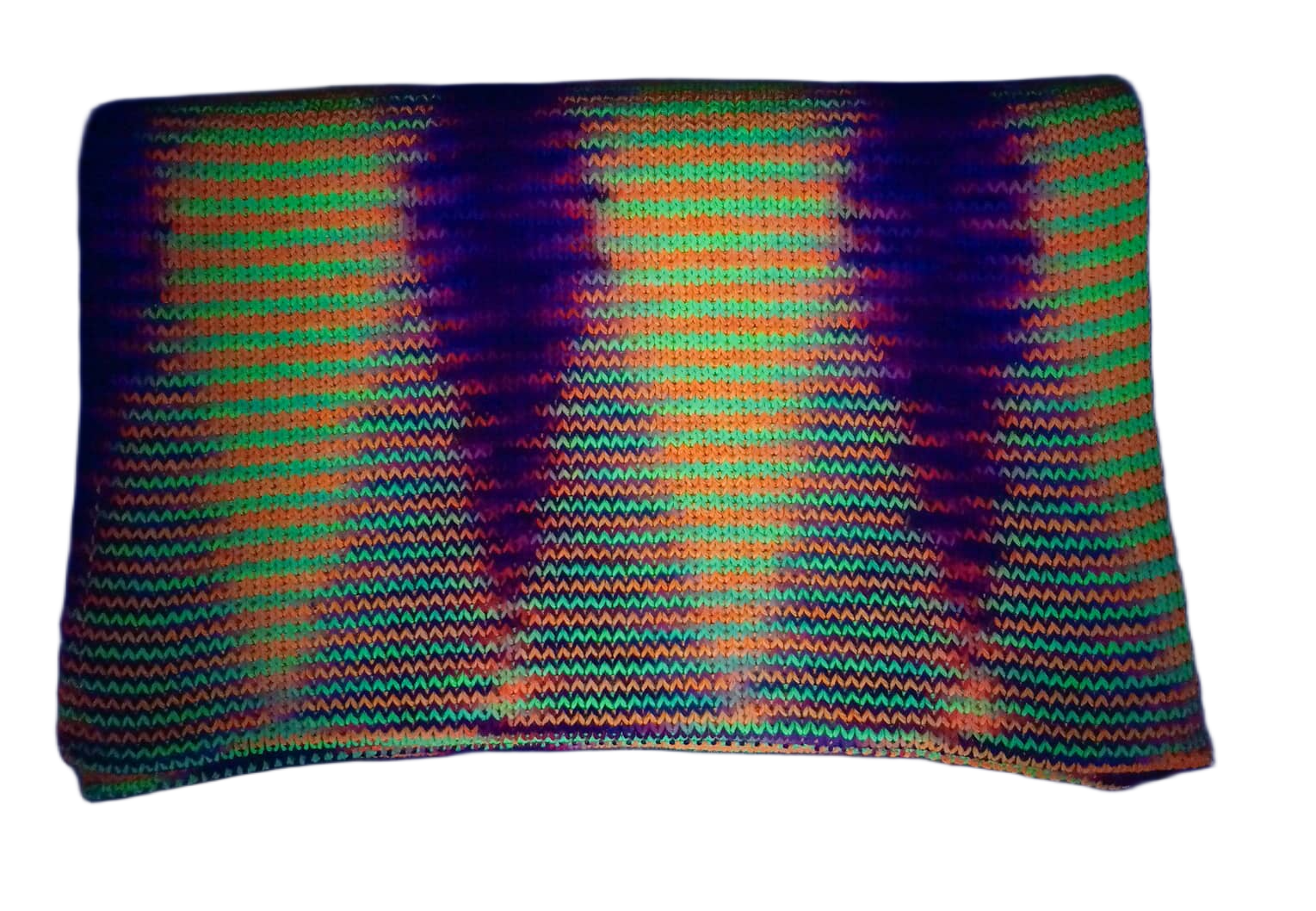 Our 100% merino wool scarves are hand-dyed and double-knit on flatbed knitting machines to make them extra thick and durable. This scarf has been made with fluorescent dyes that glow under blacklight!